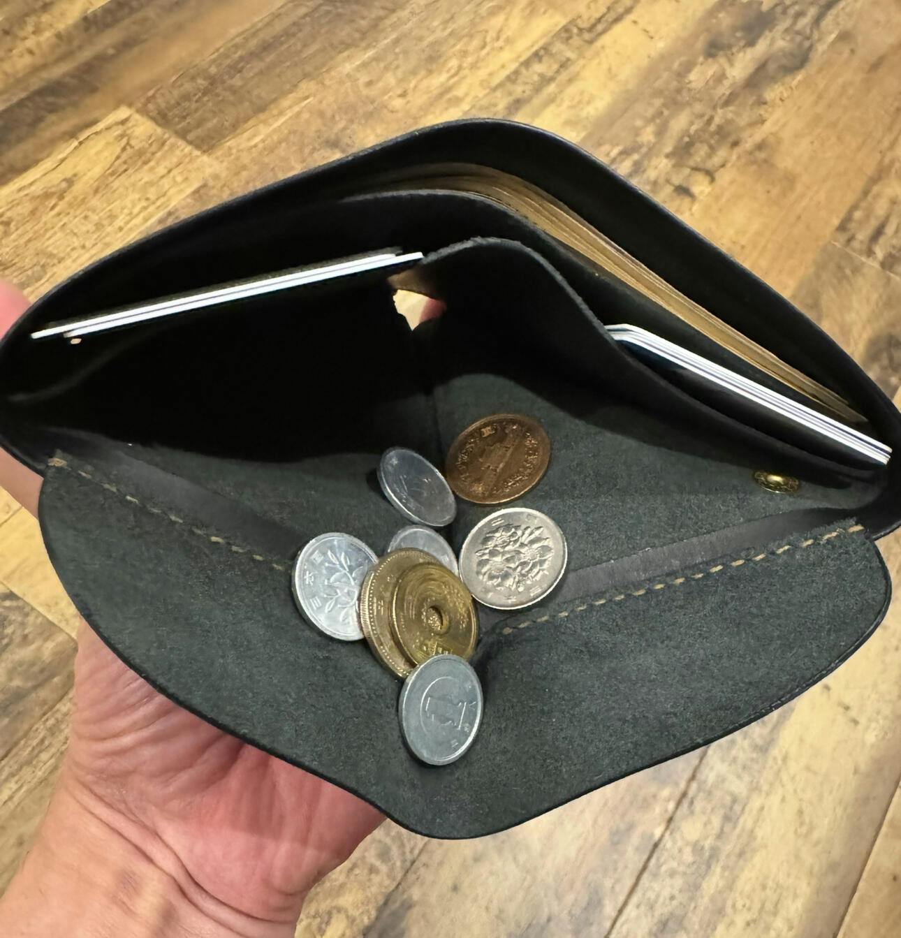 なるべくコンパクトにするには、中身をひとつにまとめて入れるのが良いと考えて作った二つ折り財布です。